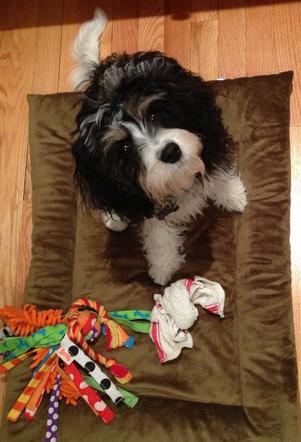 This is Bandit. He is a tri-colored sable. His coloring is very symetrical on his face. We of course think he is adorable. The end of June I had him groomed and the lady actually shaved him down to nothing. So his coat is a little shorter than what he was earlier this Spring but we kind of like his current look. I do attempt to keep his eye area trimmed but that is the only clipping I try on my own. Keely was very helpful in showing me how to trim that area when we picked him up. I also wanted to let you know that we have 2 cats and 4 kids and Bandit gets along with everyone. His favorite is mom and he loves to sleep by me. The boys(our kids) are so impressed with how fast he runs that they want to train him in agility so we may start those classes this Fall. Good luck finding the right member! I honestly think you would be very happy with a Cavachon. On by the way, big bonus....Bandit does NOT shed, not even a little bit!