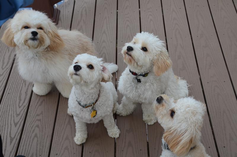 As you know, there are 4 of your cavachons in our neighborhood in Inver Grove Heights. We thought it would be fun to get them together for a photo shoot and send you some pictures. It was difficult to get them to sit still as they all wanted to play with each other. In spite of that, we did get some cute ones to share with you.